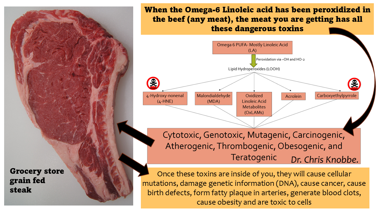 Why is this important? Excess Omega 6s in an animal's metabolism lead to chronic inflammation and peroxidation of Omega-6 Linoleic acid, producing toxic cellular byproducts. As seen in the chart below, these toxic byproducts are not only detrimental to the animals, but to we humans who consume them. In addition, the excess Omega-6s contribute to an imbalance in our own diets, which leads to the same toxic peroxidation cascade within our own cells.