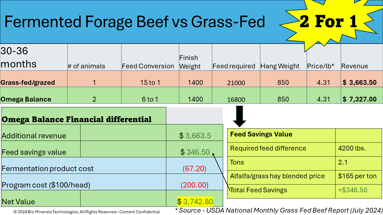 There are savings and additional profit to be had even if you are a feed-lot operation. Your animals will be healthier, and they will grow and marble better on the fermented forage than even on the high-grain diets, and the cost savings can be significant! Using the Omega Balance Natural Beef program, your animals can qualify for the grass-fed market (we never use any grain). The grass-fed market premium adds significantly to your bottom line and the cost of gain savings pads that increase significantly.